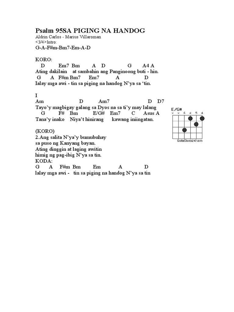 C F E G Am D Em Chords for SA PIGING NG ATING PANGINOON with song key BPM capo transposer play along with guitar piano ukulele mandolin. As a challenge to myself to arrange pieces I made this SATB arrangement of this very inviting and beautiful piece. Panginoon turuan Mo ako maging bukas-palad.
