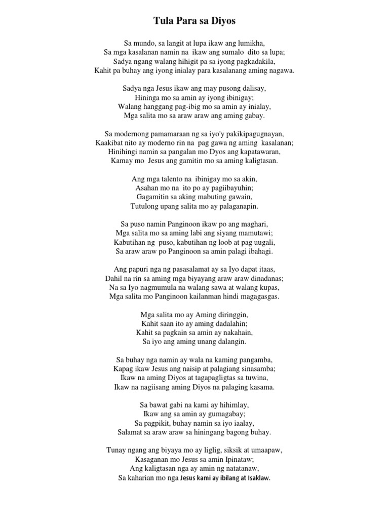 Sa Diyos na Buhay ni. Ang Diyos ay Pag-ibig. Ang halimbawa na ito ay may sukat at tugma na alay pasasalamat at dasal ng makata sa ating Panginoon.