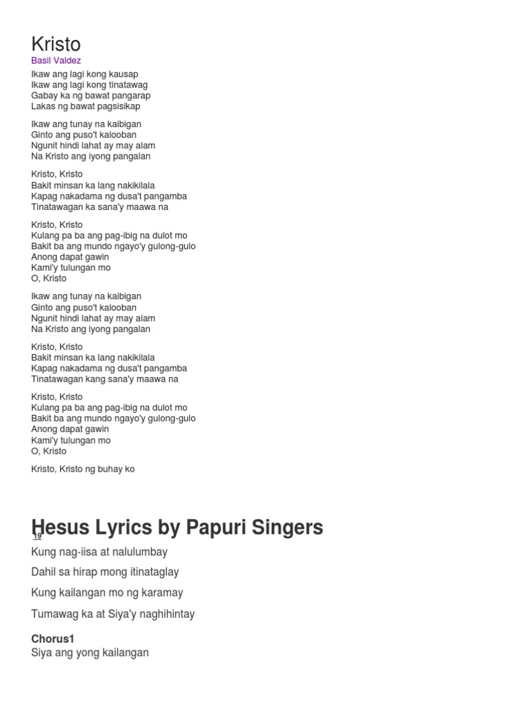 17 Kamiy Basbasan ng Pala. Ikaw ay nag-iisang Diyos ng kaligtasan. 21 Poong Jesus Lubog na ang Araw.