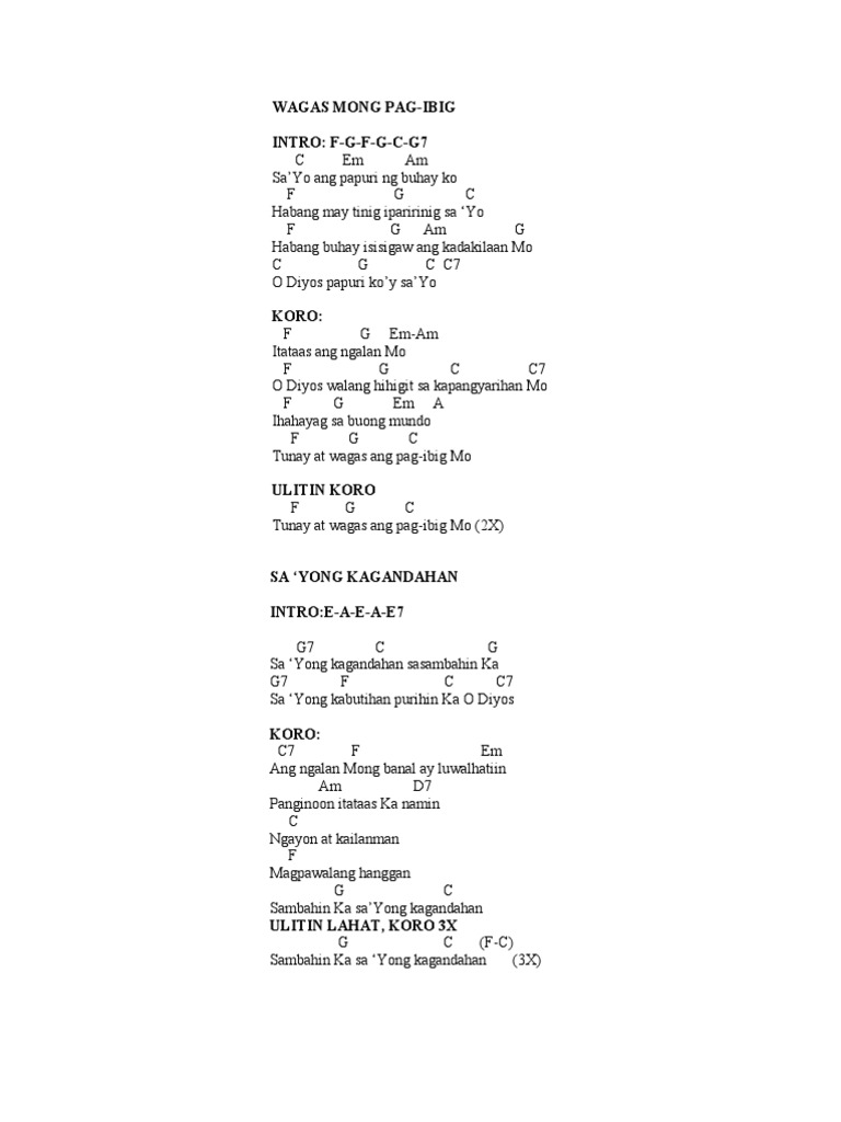 Verse 1 D DF Bm G A A7 Sasambahin kita ama At pupurihin ka sa twina D DF Bm G Ngalan mo ay itataas Sayo ang parangal A A7 Hanggang wakas Chorus Fm Bm G Dakila ka panginoon Luwalhatiin ka A Sa habang panahon Fm Bm G Mahal kita panginoon Kayat dapat kang purihin Em A D At pasalamatan habang panahon Outro G Kayat dapat kang. Sa ating mga kaaway.